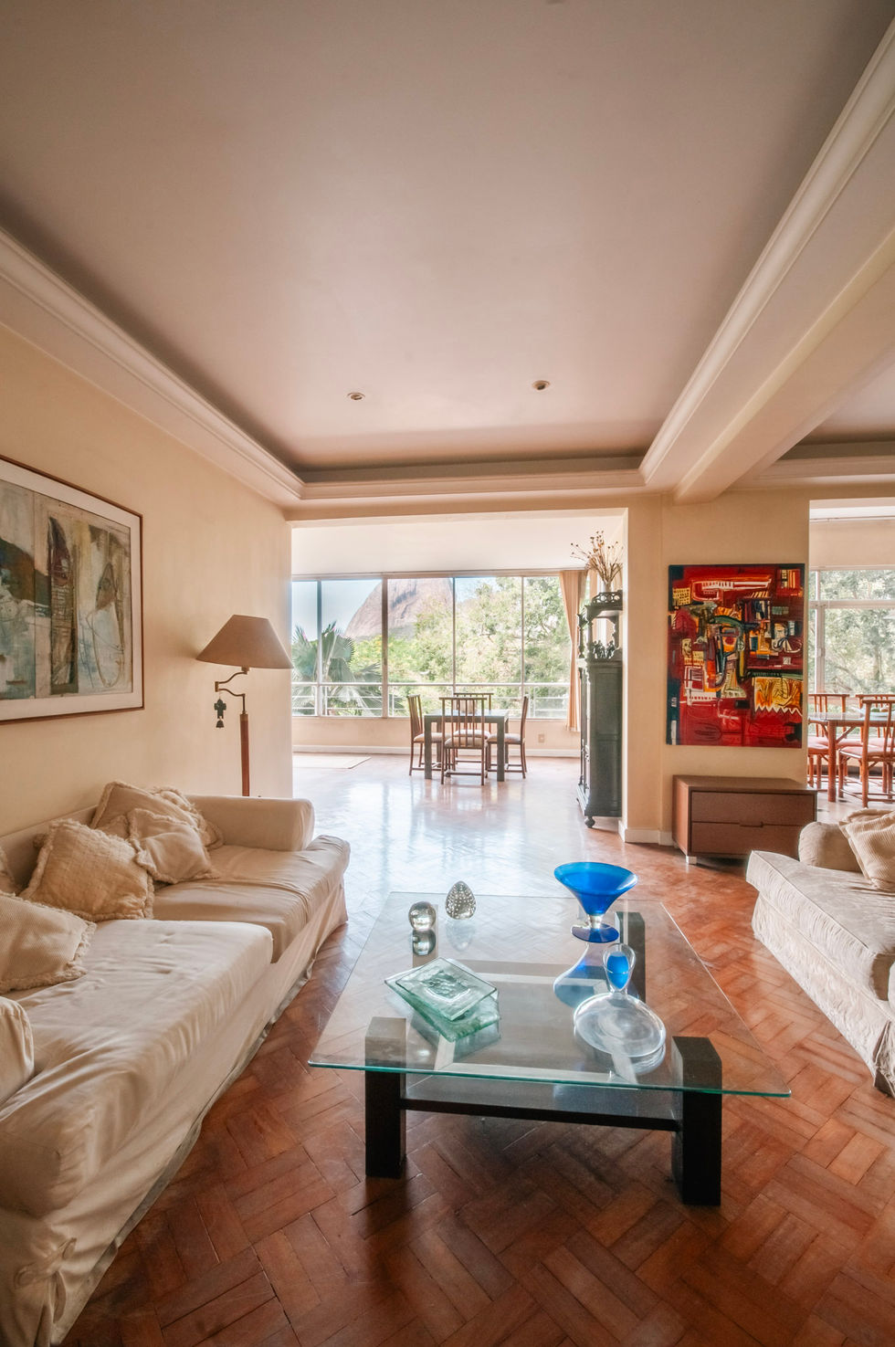 Fotografei este apartamento de 240 m² para uma corretora imobiliária, com o objetivo de valorizar o imóvel em seu processo de venda. Localizado na Praia de Botafogo, o apartamento é um clássico cheio de personalidade, com amplas janelas que emolduram a vista para o Pão de Açúcar. O ensaio buscou destacar a luminosidade natural, os detalhes da arquitetura antiga e a integração entre os ambientes internos e a paisagem única do Rio de Janeiro.